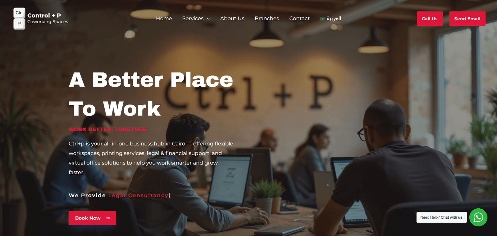 A clean and modern website designed for Ctrl+P Coworking Spaces. The layout emphasizes clarity with bold headlines, strong call-to-actions, and a professional color scheme. The design highlights services through a structured navigation and user-friendly flow, ensuring visitors quickly find workspace and business solutions.